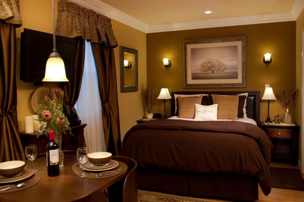 - Serene Guest Room in in a separate building Warm Earth Tones with Crown Moldings and Hardwood Floors